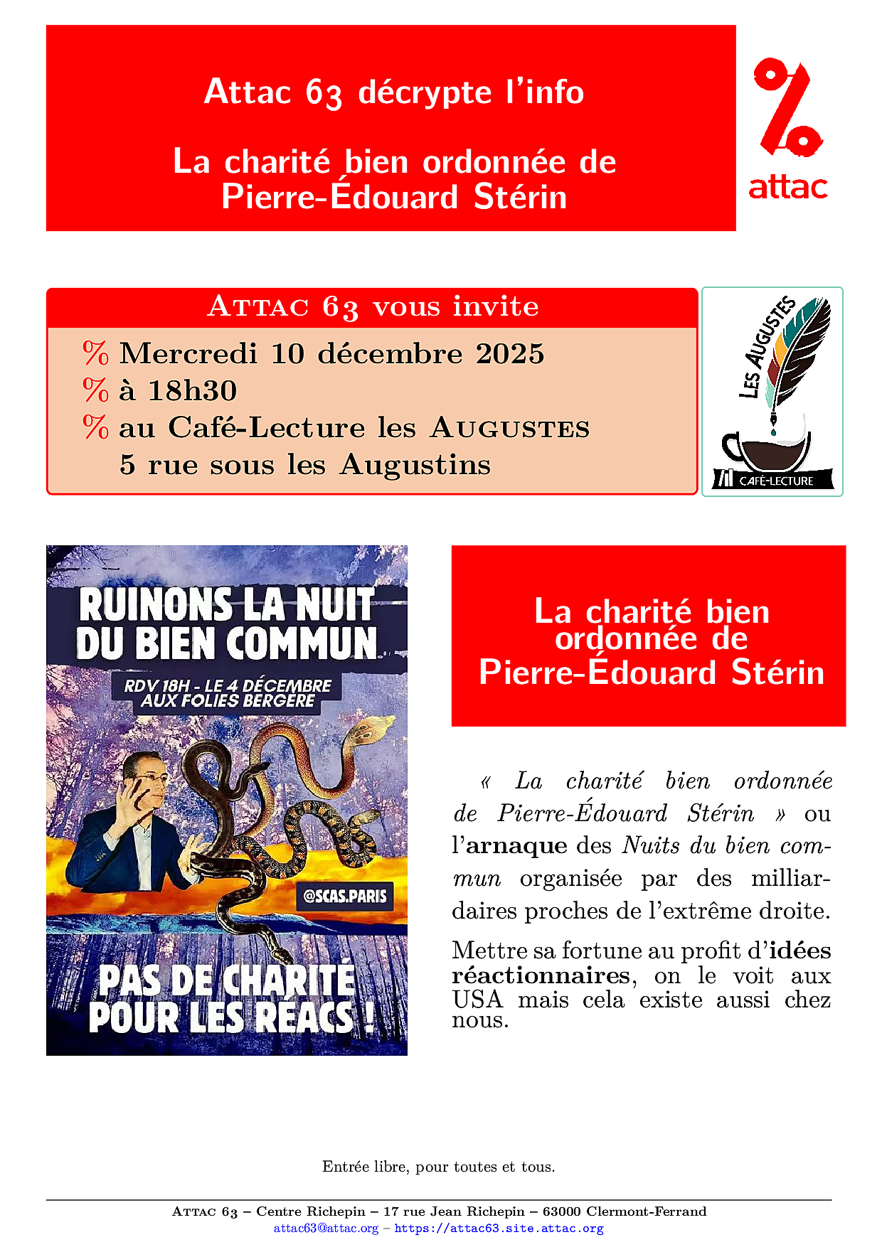 🚨Ne manquez pas votre RDV avec Attac63, au Café-lecture « Les Augustes », ce mercredi à 18h30.