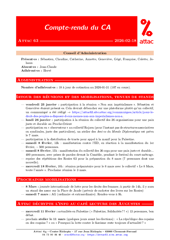 - vendredi 23 janvier : participation à la réunion "Non aux impérialismes". Sébastien et Geneviève étaient présent·es. Cela devrait déboucher sur une plateforme plutôt qu’un collectif, un communiqué a été rédigé → https://attac63.site.attac.org/communiques/article/pour-le-droit-des-peuples-a-disposer-d-eux-memes-non-aux-imperialismes-non-a.