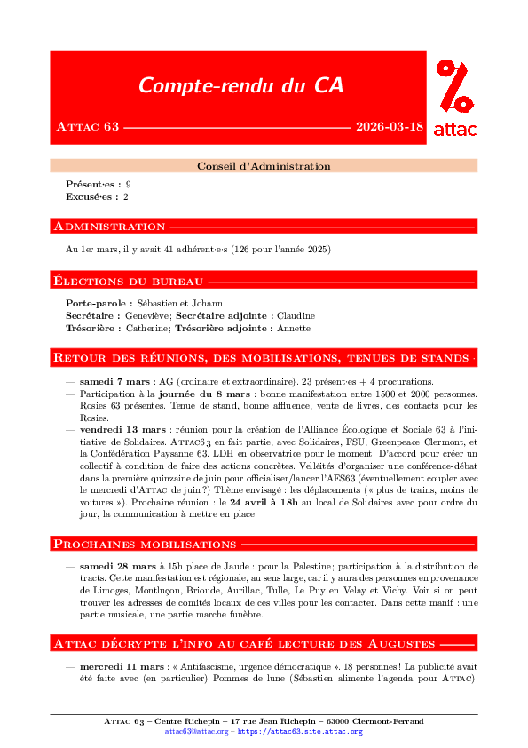 • vendredi 13 mars : réunion pour la création de l’Alliance Écologique et Sociale 63 à l’initiative de Solidaires. Attac63 en fait partie, avec Solidaires, FSU, Greenpeace Clermont, et la Confédération Paysanne 63. LDH en observatrice pour le moment. D’accord pour créer un collectif à condition de faire des actions concrètes. Velléités d’organiser une conférence-débat dans la première quinzaine de juin pour officialiser/lancer l’AES63 (éventuellement coupler avec le mercredi d’Attac de juin ?)